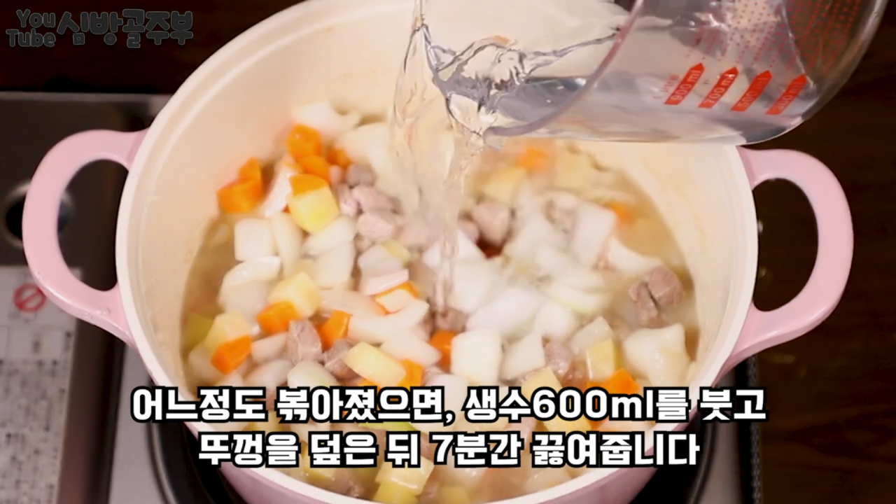 어느정도 볶아졌으면, 생수600ml를 붓고 뚜껑을 덮은 뒤 7분간 끓여줍니다
