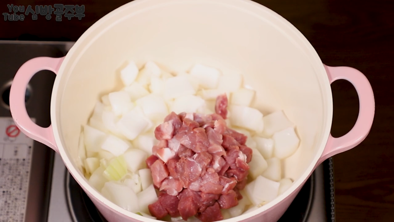 돼지고기(앞다리살)와 양파를 넣고 우선 1분간 달달 볶아주세요