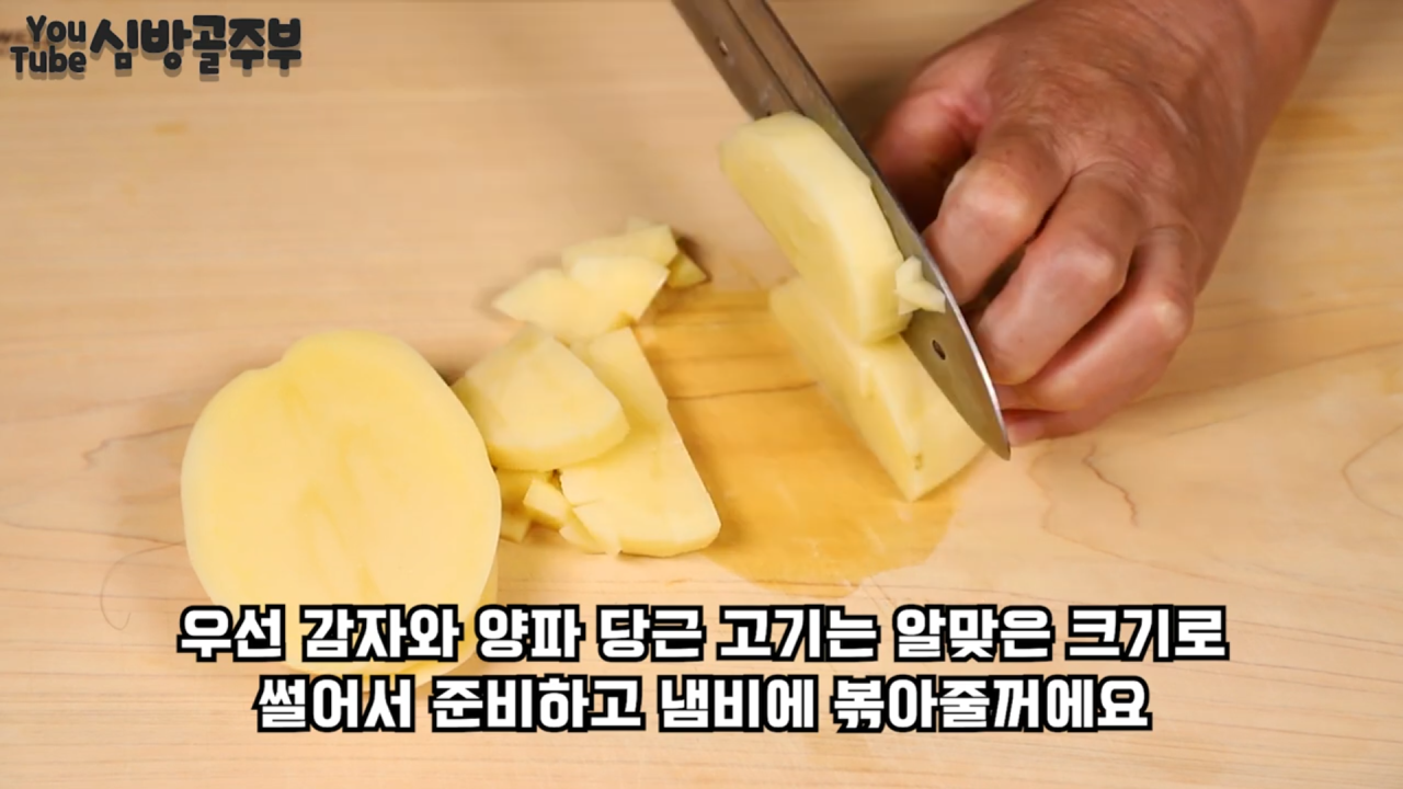 우선 감자와 양파 당근고기는 알맞은 크기로 썰어서 준비하고 냄비에 볶아줄꺼에요